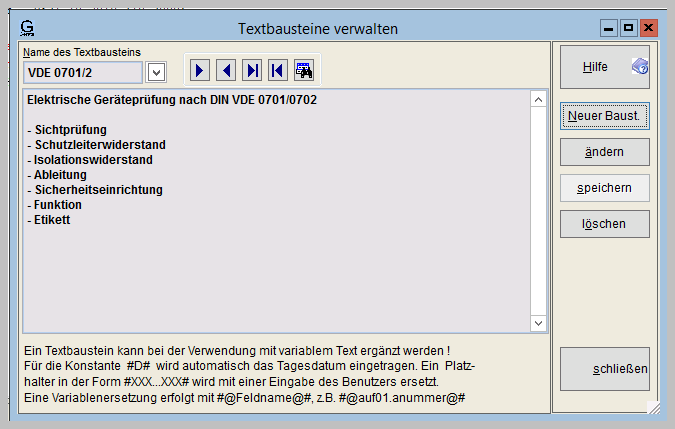 Wiederkehrende Texte beliebiger Länge können als Textbaustein angelegt und dann beliebig oft den Geräten oder Prüfungen zugewiesen werden.